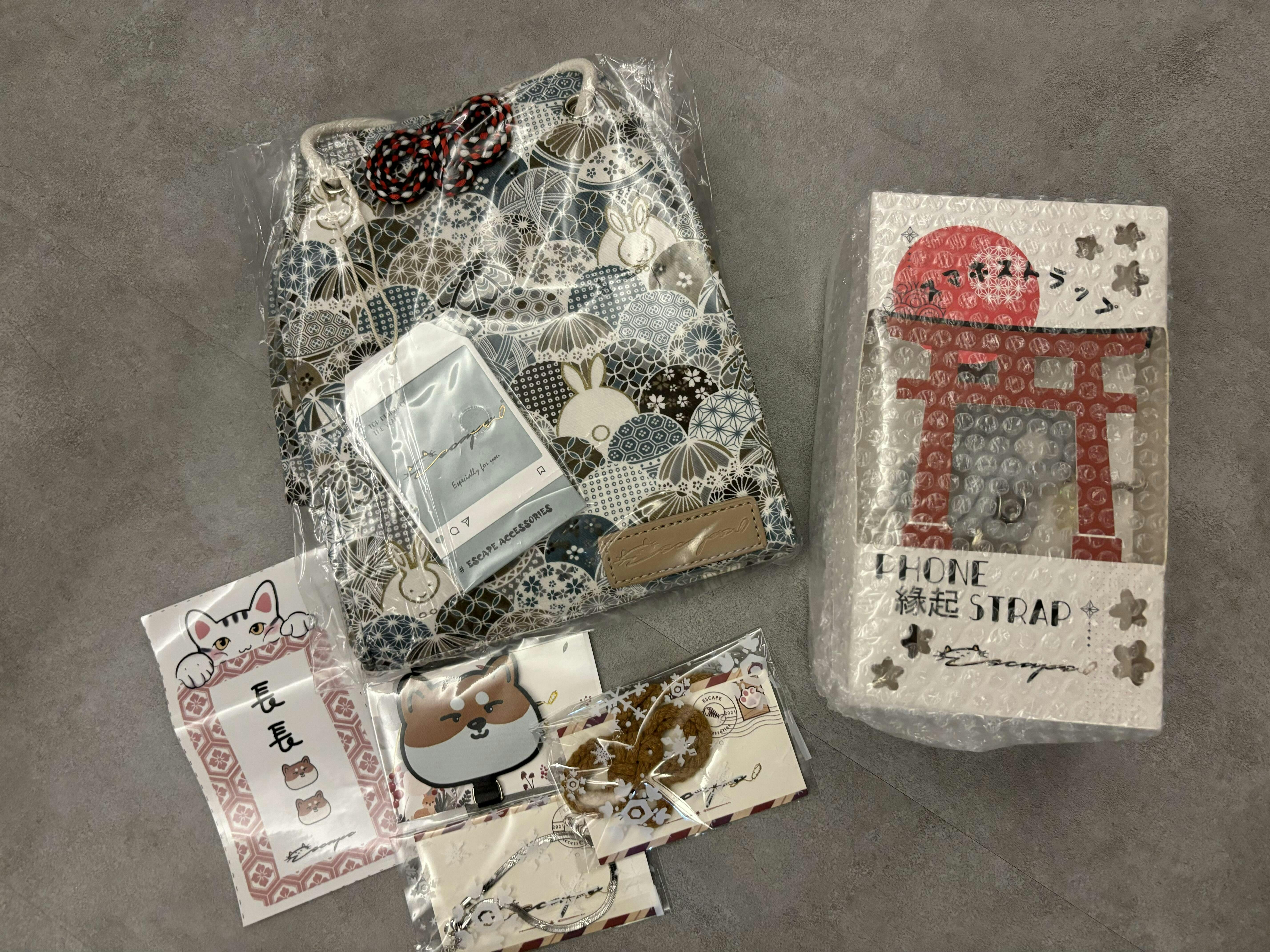 Got a brown leather bag and demin cloth bag which was exactly what I wanted 💯 :) Also got 2 phone straps (1 purple and 1 blue) which are too bright for my preference . Would have preferred if the colours are darker. Didn't get the Shiba phone clip ( but a black cat phone clip ) which was a surprise as I saw all previous orders have the Shiba phone clip. The black cat phone clip also came with the phone straps, so have 3 cat phone clips in total.
